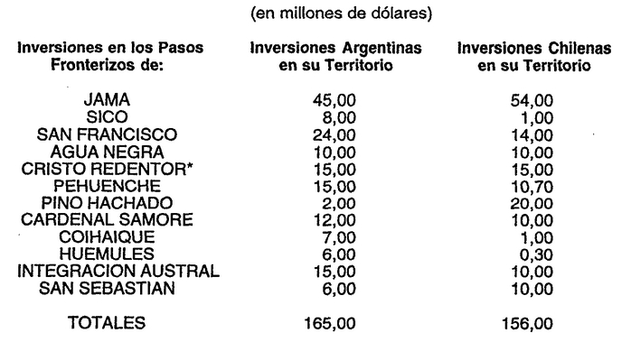 Programa sobre montos básicos a invertir por la República de Chile y la República Argentina en conexiones viales por los pasos fronterizos durante el período 1996-2000