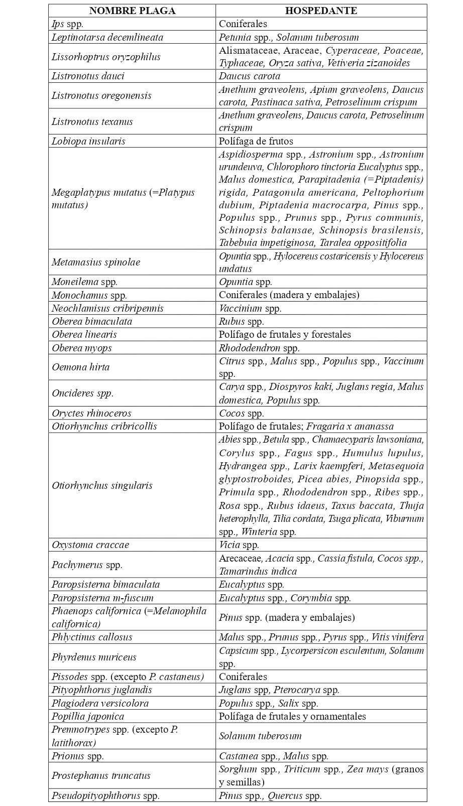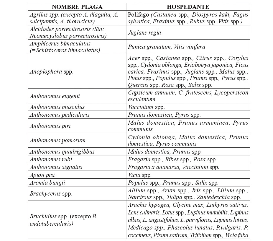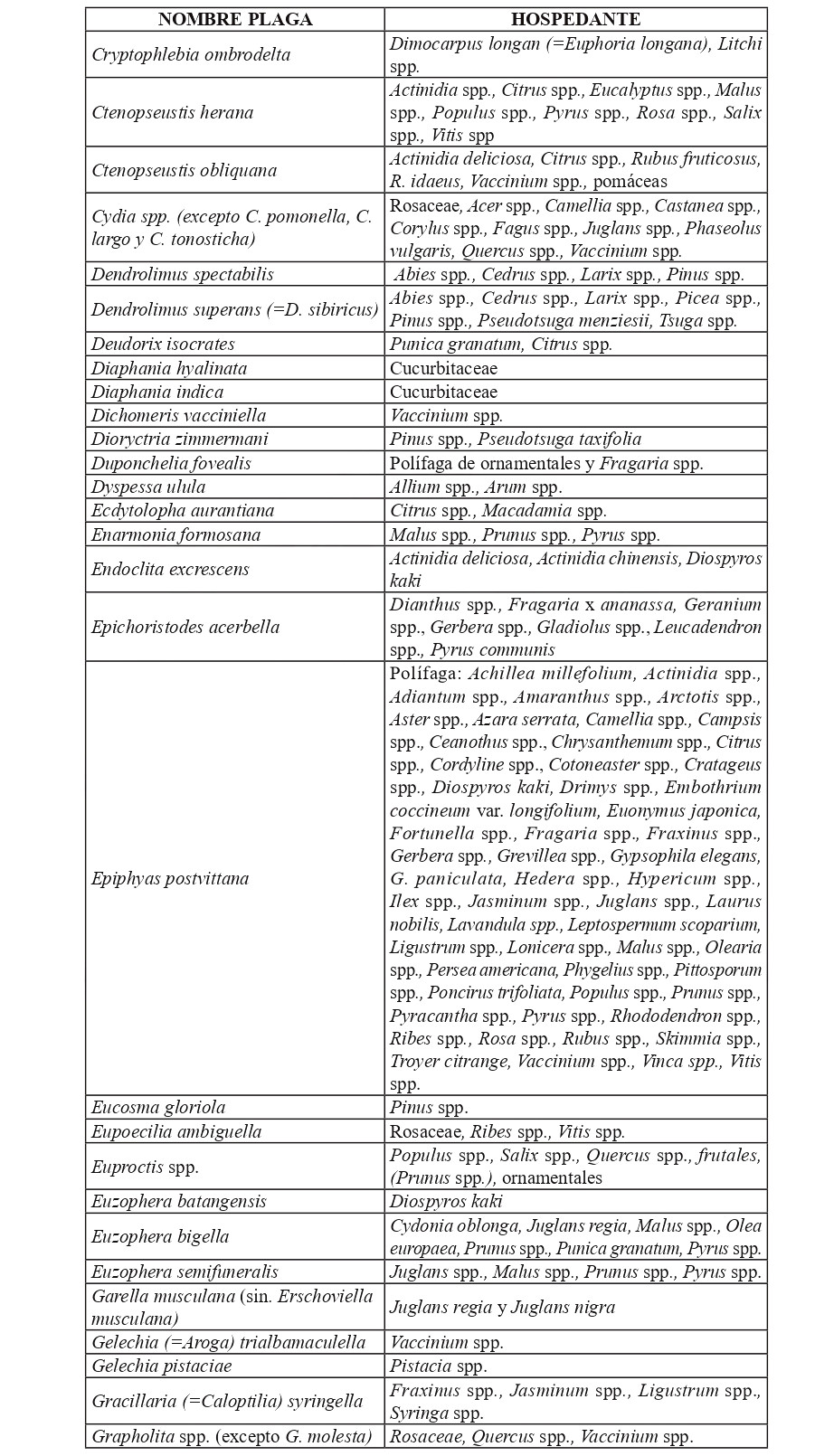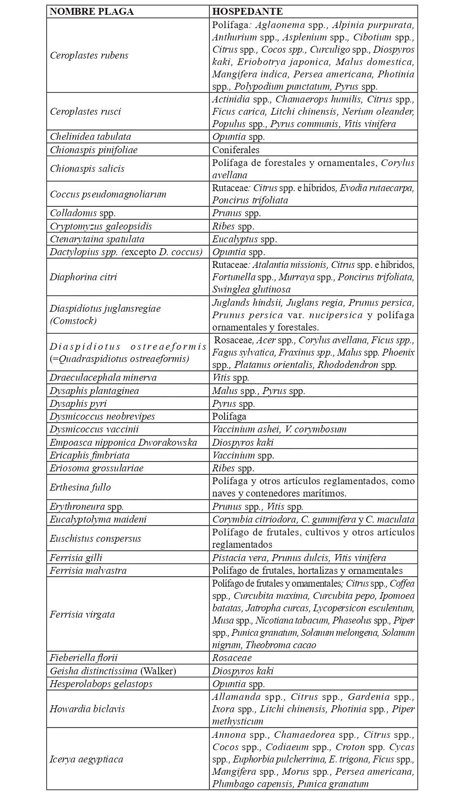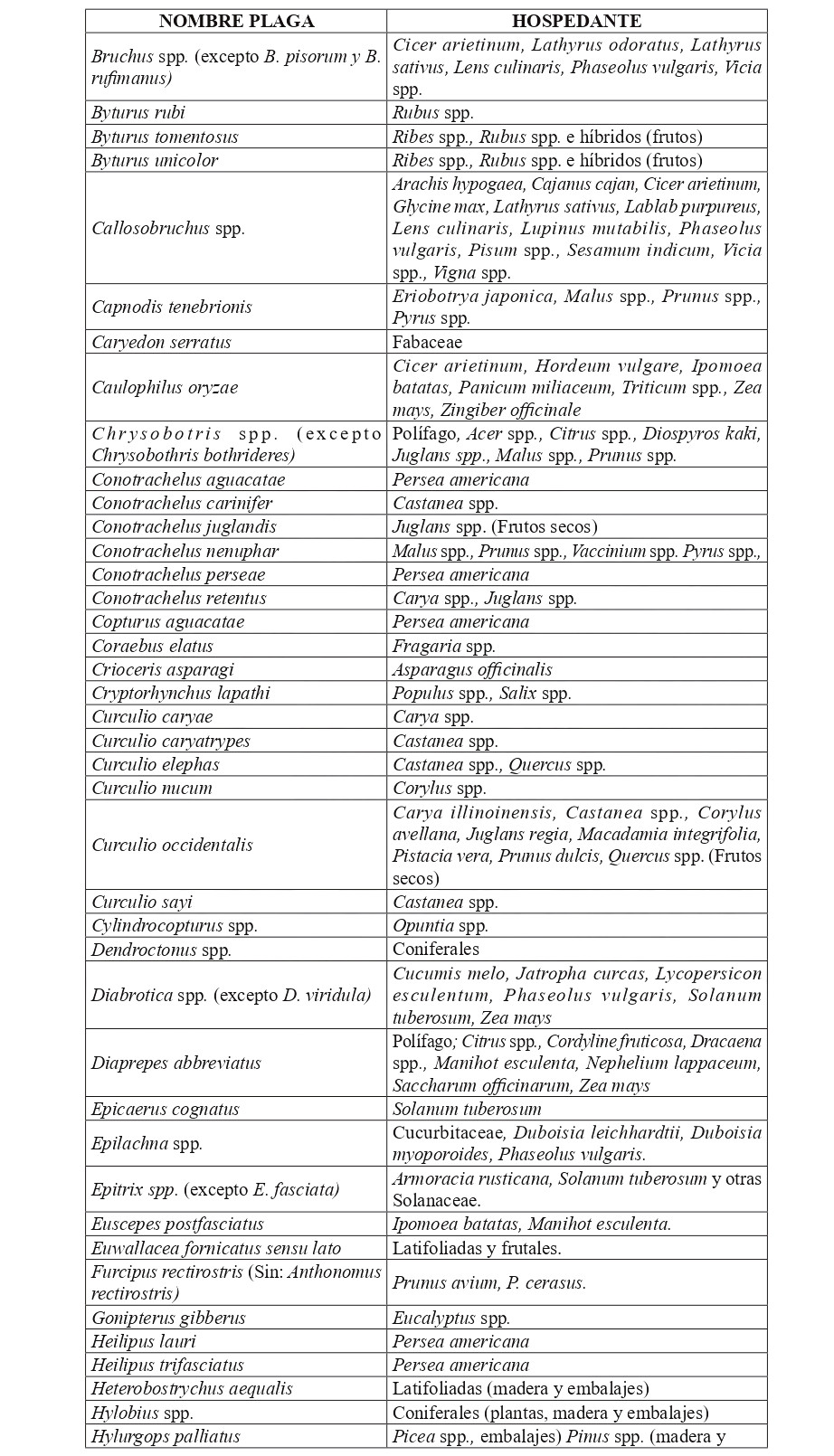 La lista que a continuación se señala considera plagas presentes en parte del territorio nacional y sometido a control oficial de contención, supresión o erradicación:
