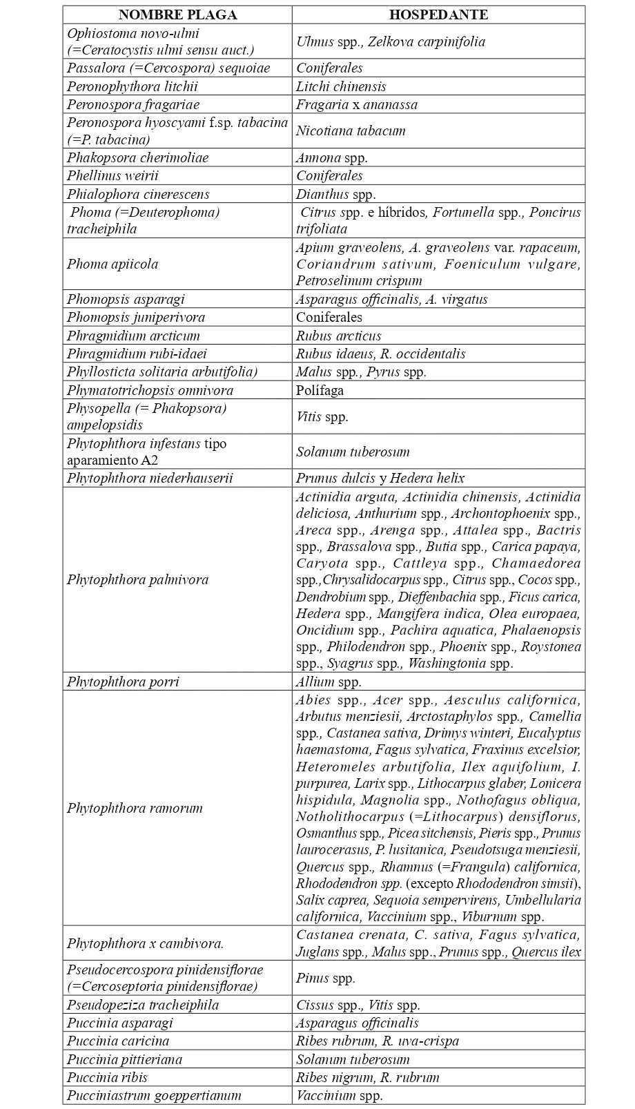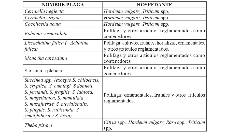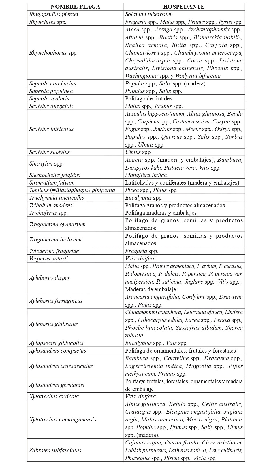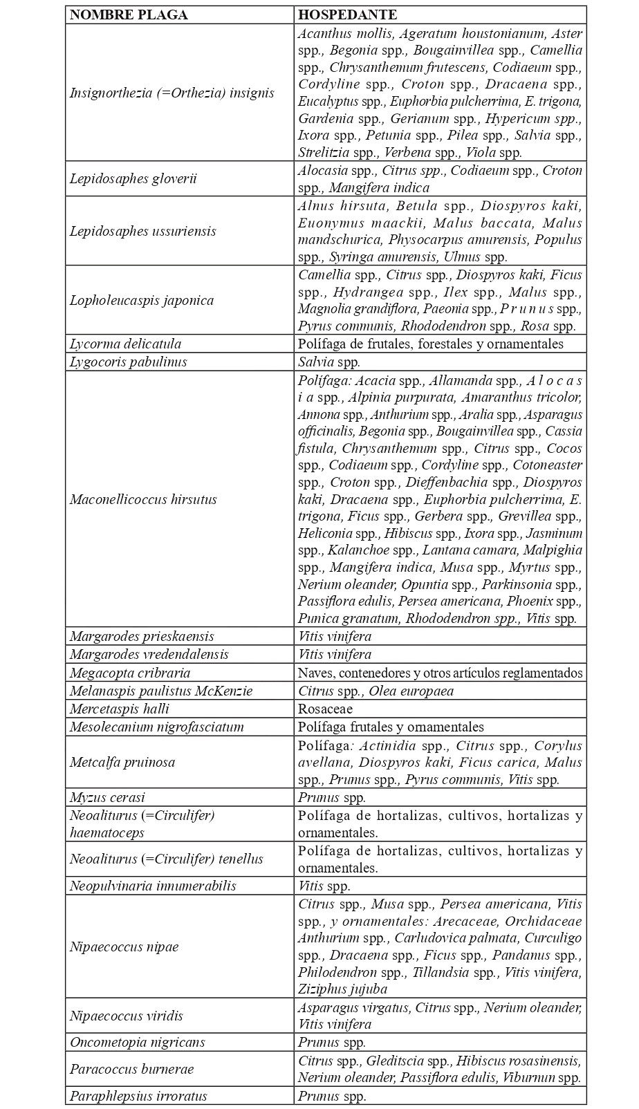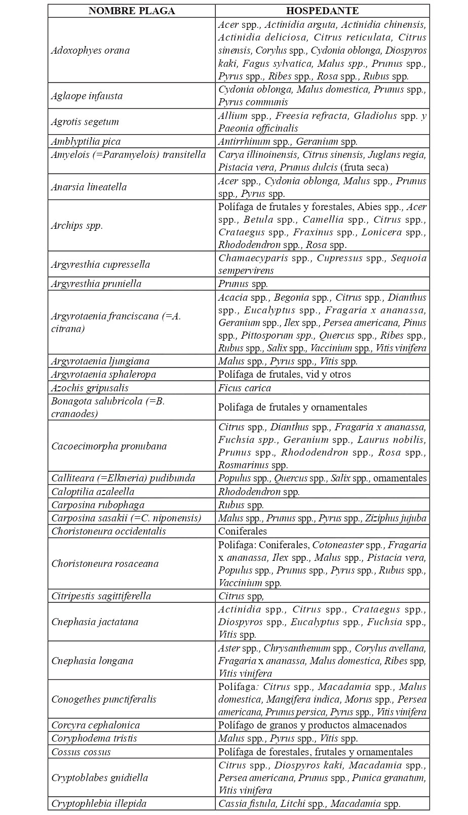 La lista que a continuación se señala considera plagas presentes en parte del territorio nacional y sometido a control oficial de contención, supresión o erradicación: