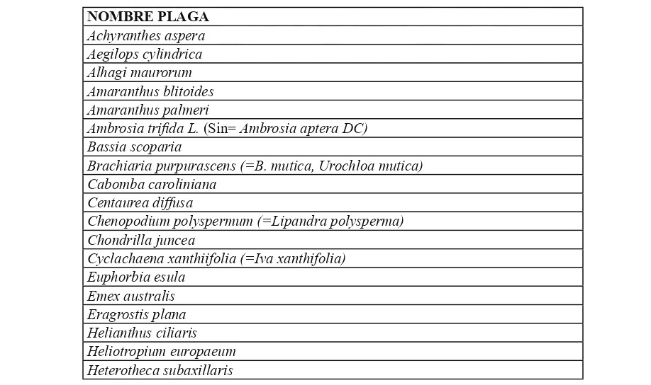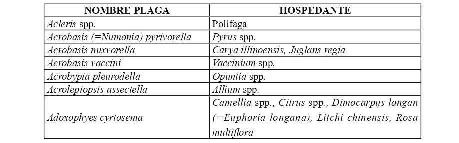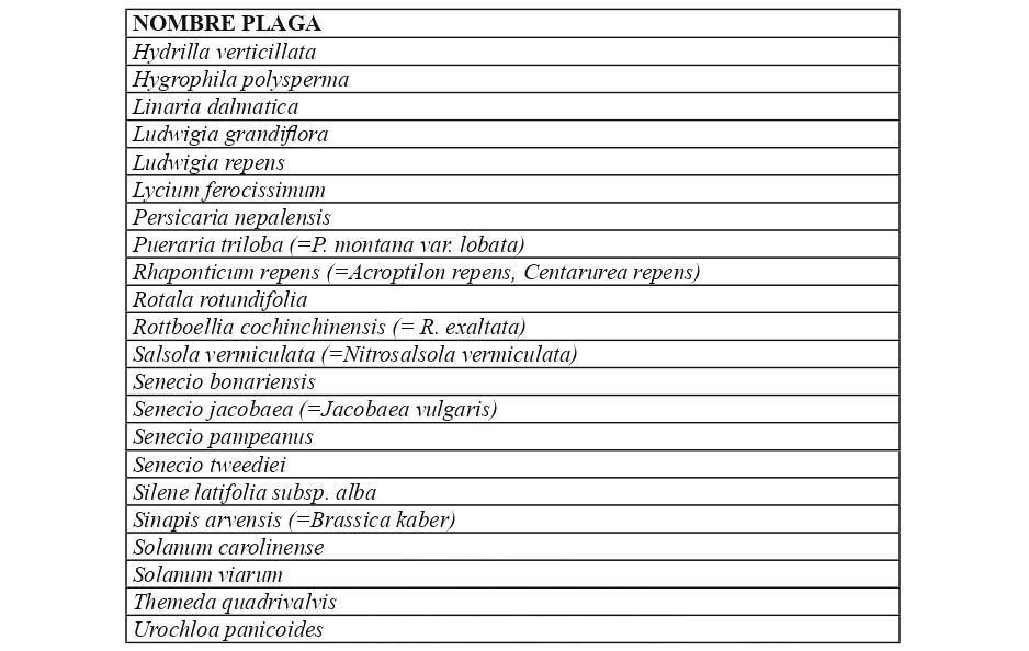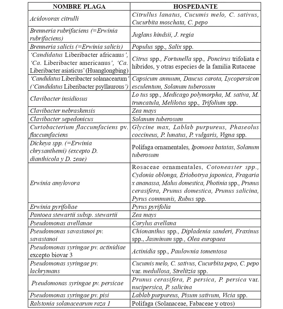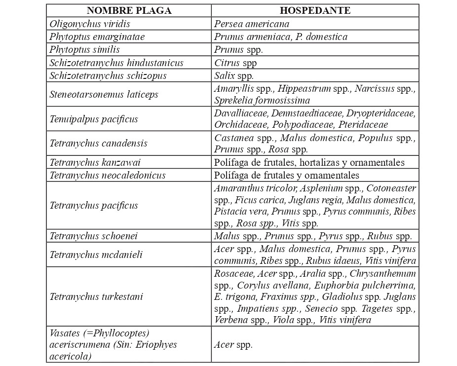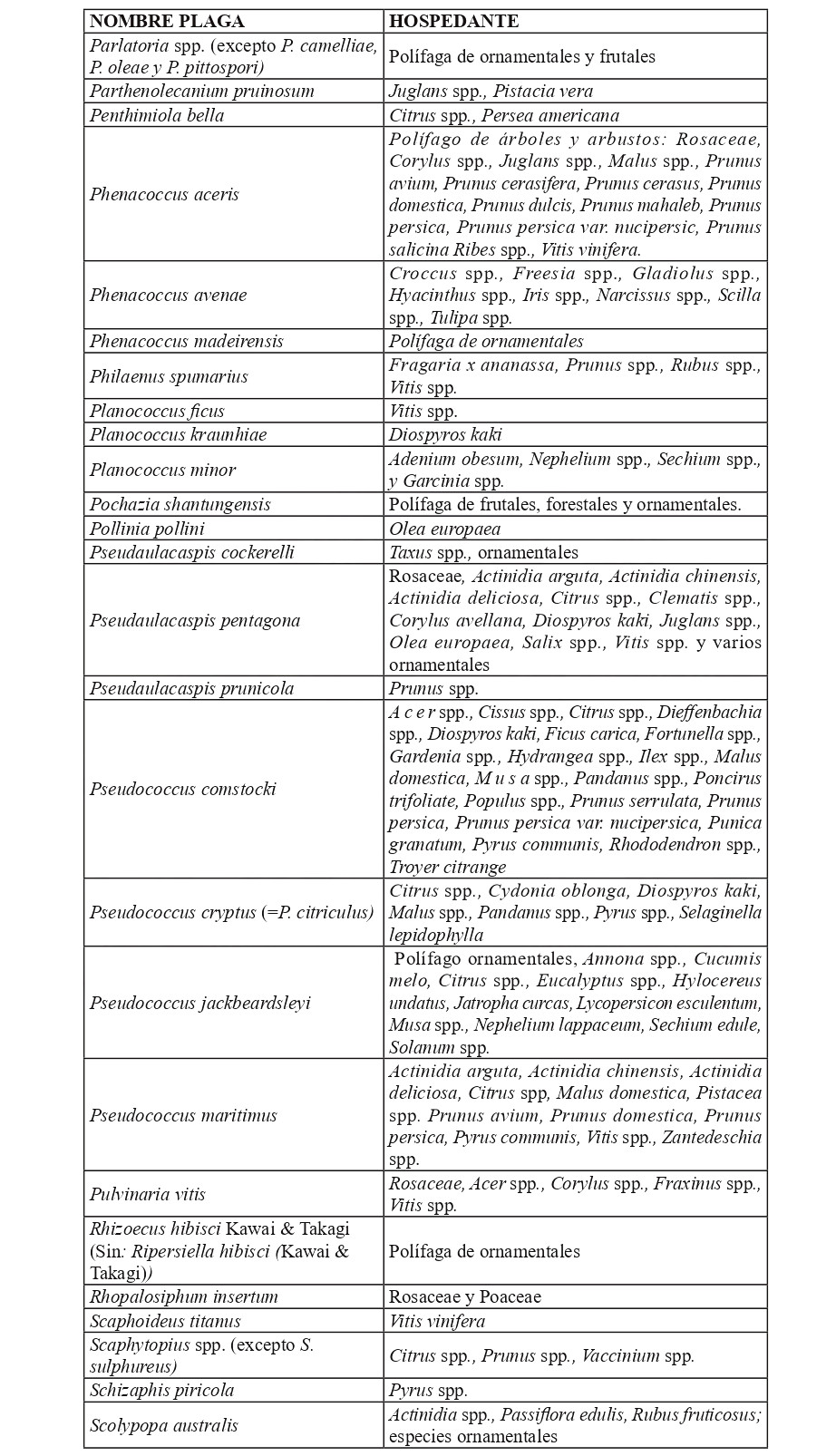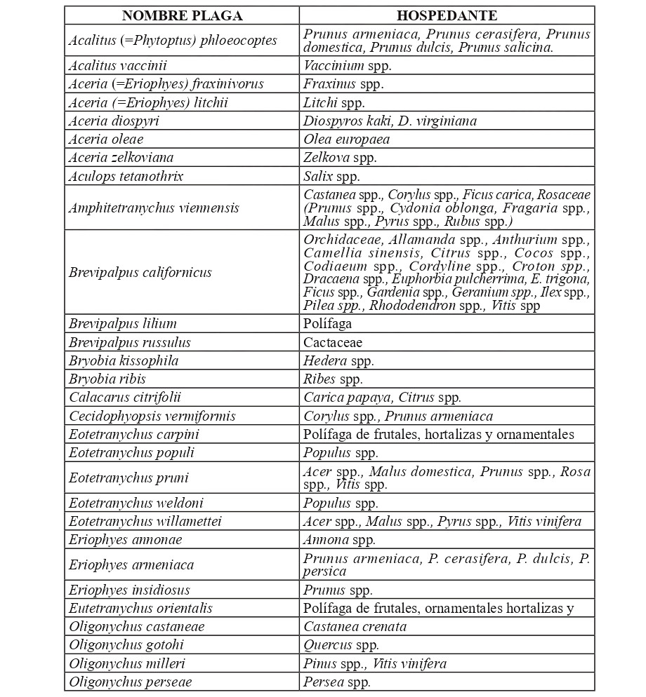 La lista que a continuación se señala considera plagas presentes en parte del territorio nacional y sometido a control oficial de contención, supresión o erradicación: