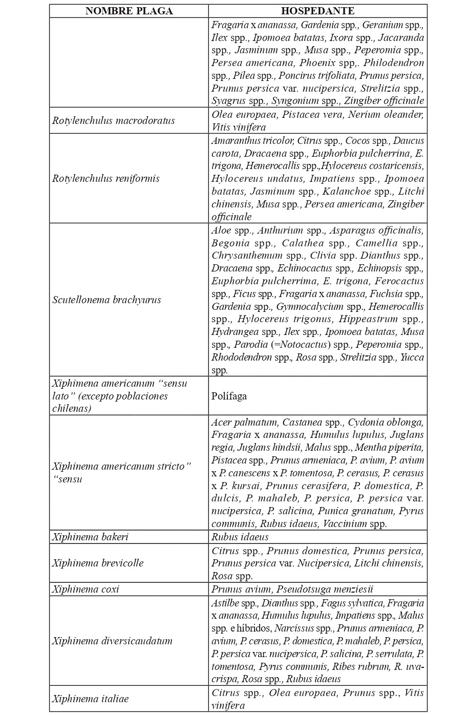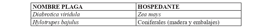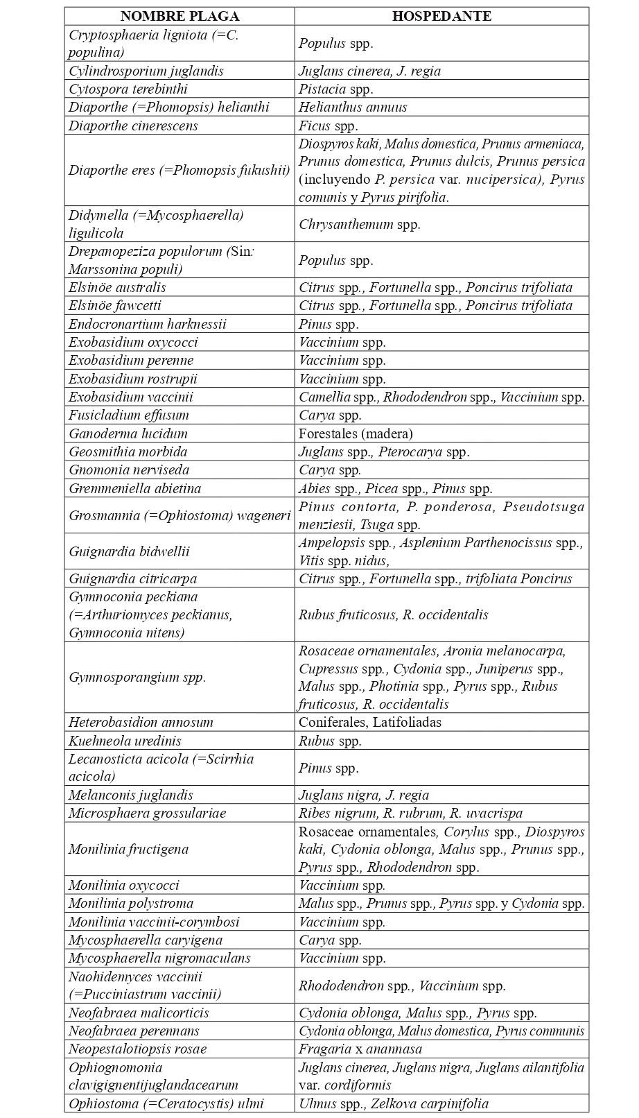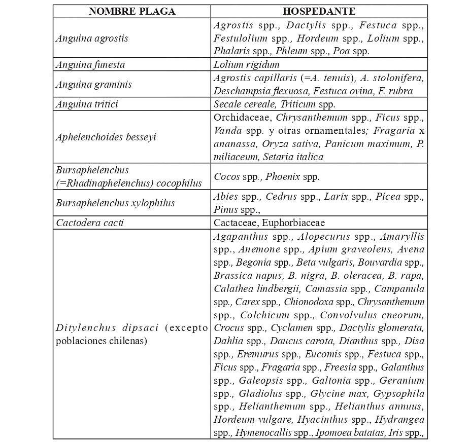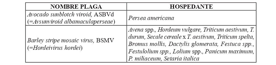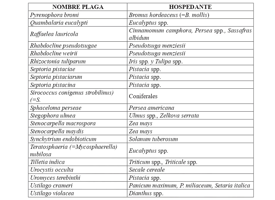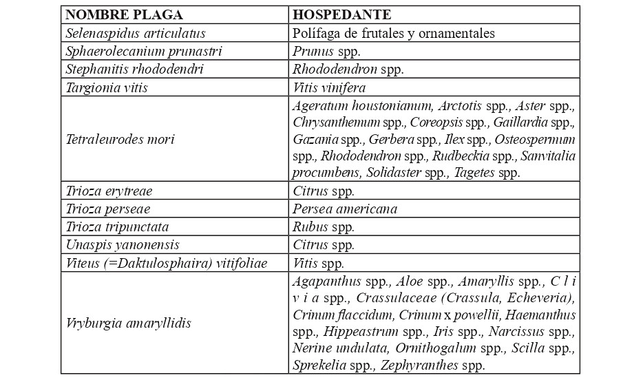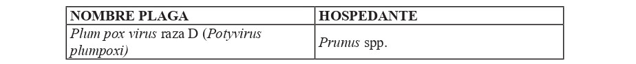 D.O. 14.10.2025 vigésimo: Las plagas señaladas a continuación se encuentran ausentes del territorio nacional, tanto insular como continental y se encuentran relacionadas a los hospedantes que indica: