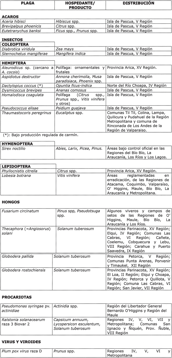 Artículo Tercero: Declárese a todo el territorio de Chile, tanto continental como insular, país libre de las Plagas Cuarentenarias mencionadas en el Artículo vigésimo, correspondiente a la lista de Plagas Cuarentenarias ausentes en el país, listado que será actualizado periódicamente según la información emanada de las acciones de Vigilancia Fitosanitaria, la evaluación de la información internacional, los registros de intercepción de plagas de los puertos de ingreso y los Análisis de Riesgo de Plagas correspondientes.