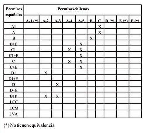 TABLA DE EQUIVALENCIAS ENTRE LOS PERMISOS ESPAÑOLES Y CHILENOS