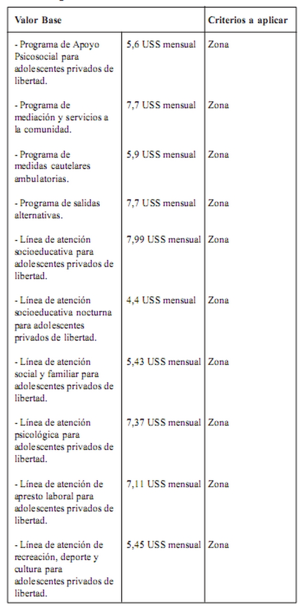 Tercera: Mientras, de acuerdo a la ley, los menores de 18 años infractores a la ley penal, permanezcan en establecimientos penitenciaros administrados por Gendarmería de Chile, dicha atención se subvencionará bajo la línea centros residenciales con un valor de 6,8 USS por niño atendido. Esta modalidad de atención estará excluida del sistema de licitación previsto en la presente ley.