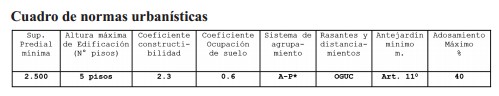 Artículo 10º SUBDIVISIONES PREDIALES Las solicitudes de subdivisión se aprobarán siempre que los lotes resultantes no sean inferiores a 250 m2, debiendo además, cumplir con las normas correspondientes a cada zona de la presente ordenanza, excepto en aquellas zonas cuya superficie mínima se indica expresamente en el cuadro de normas urbanísticas y/o en las disposiciones complementarias. Lo anterior sin perjuicio de lo estipulado en el Título 6 de la O.G.U.C.
