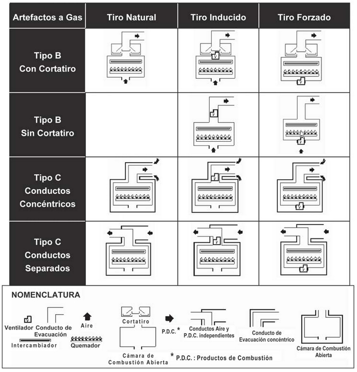 De acuerdo a esta clasificación los artefactos a gas se dividen, entre otros, en los Tipo A, Tipo B y Tipo C, según se describe a continuación: