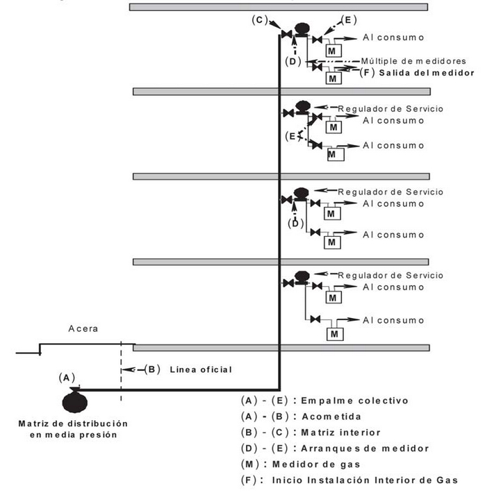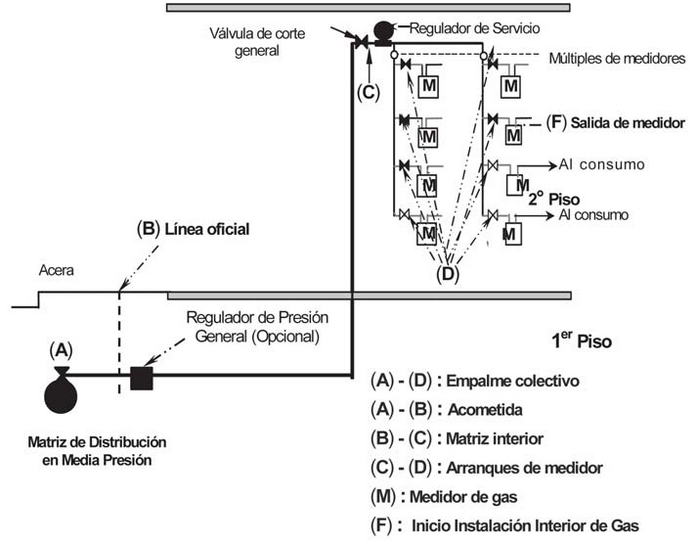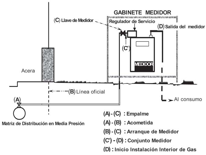 10.10.1 Arranque de medidor. Conjunto de elementos, entre otros tuberías, válvulas de corte y regulador de servicio, cuando corresponda, que conduce el gas desde el término de la acometida (empalme individual) o de la matriz interior (empalme múltiple), hasta la entrada del medidor o conjunto medidor, según corresponda.