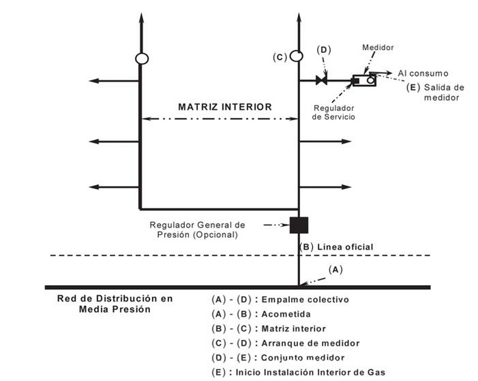 Sección del empalme constituido por el conjunto de elementos que conducen el gas desde la matriz de distribución o red de transporte, hasta la línea oficial a que se refiere el artículo 1.1.2 de la Ordenanza General de Urbanismo y Construcciones (OGUC), aprobada mediante el D.S. 47/1992, "Fija Nuevo Texto de la Ordenanza General de la Ley General de Urbanismo y Construcciones", del Ministerio de Vivienda y Urbanismo, en adelante e indistintamente, "Ordenanza General de Urbanismo y Construcciones" o disposición que la reemplace.