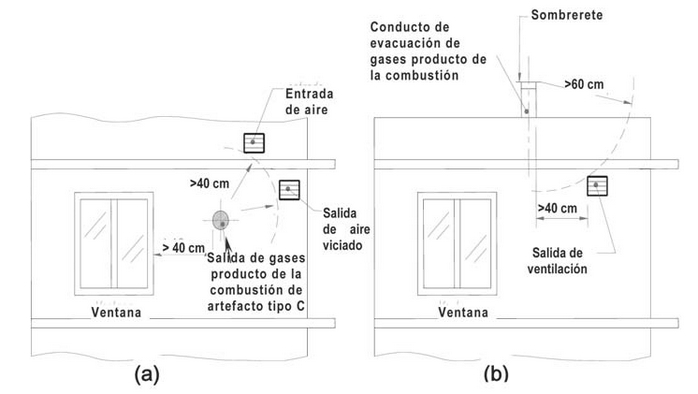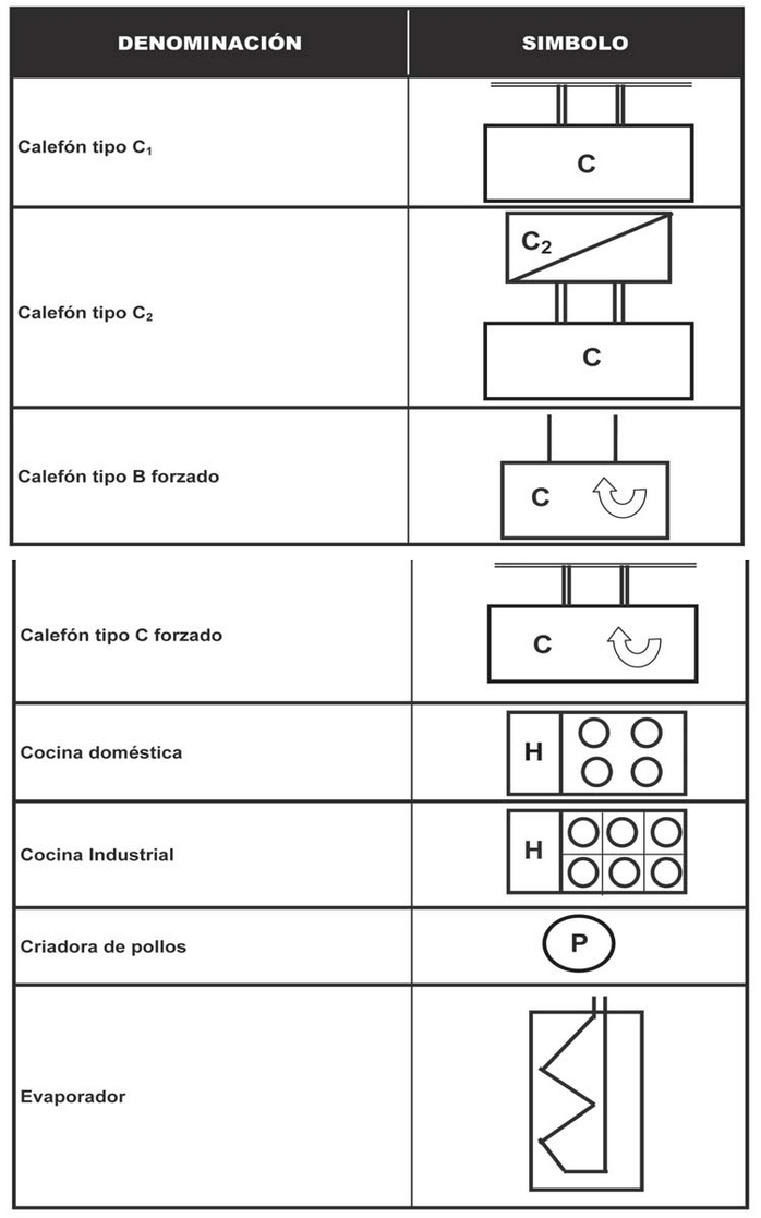 La Figura 1. Clasificación de artefactos a gas tipo B y C, muestra algunos ejemplos típicos de artefactos del tipo B y C. Una clasificación más completa para cada tipo de artefacto se entrega en la Norma Oficial Chilena NCh861.Of2001 - Combustibles gaseosos - Artefactos a gas - Definiciones y clasificación; o disposición que la reemplace.