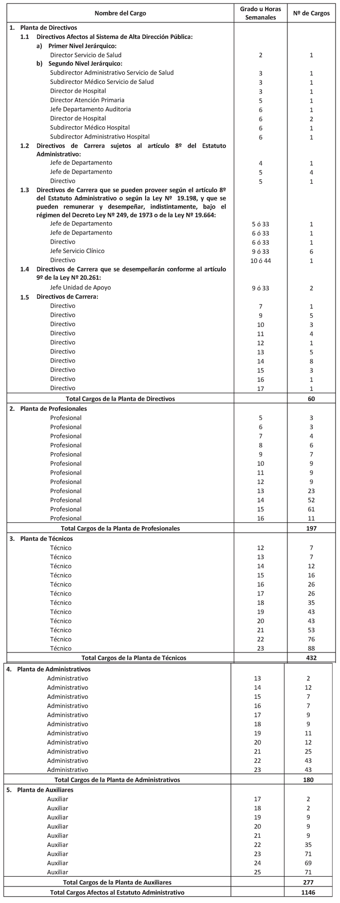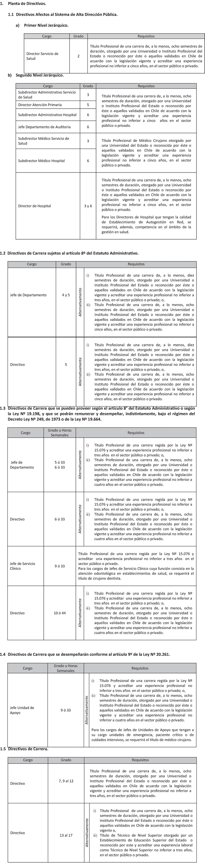 El Art. 1° del Decreto con fuerza de Ley 20, Salud, publicado el 17.01.2015, modifica el punto 1.3 de la Planta de Personal establecida en el presente artículo en el sentido de suprimir, en la Planta de Directivos de Carrera, los cargos de "Directivo" y "Jefe Servicio Clínico" que la citada norma indica. Por su parte, su Art. 2° crea 242 horas en la Planta Profesional de Horas, que representan los cargos suprimidos en virtud del Art. 1°.