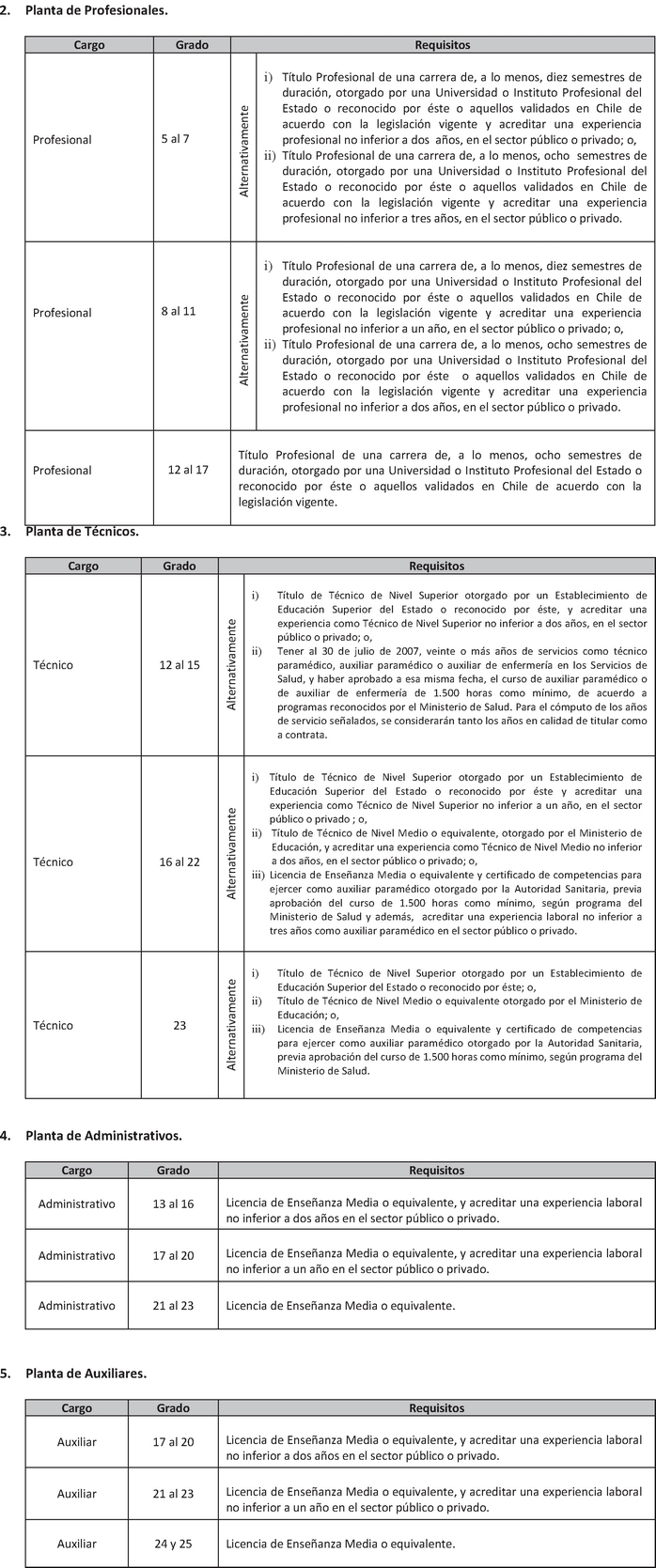 Artículo 2º. Establécense los siguientes requisitos para el ingreso y promoción en las plantas y cargos que se indican a continuación: