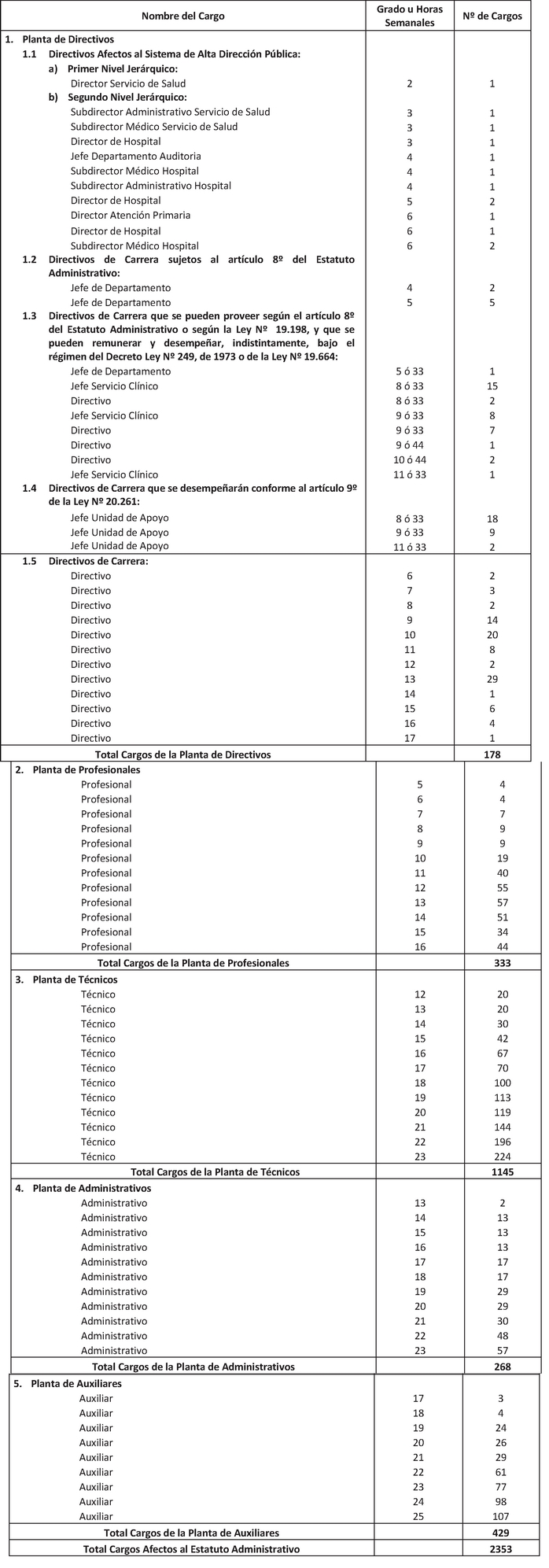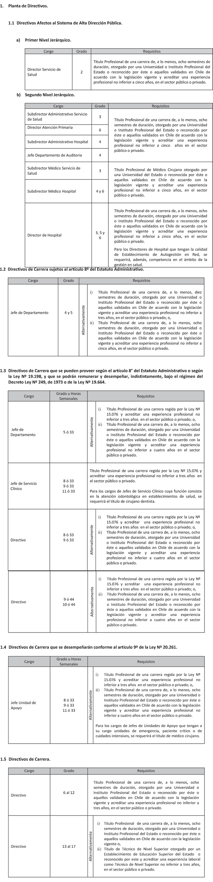 El Art. 1° del Decreto con fuerza de Ley 18, Salud, publicado el 17.01.2015, modifica los puntos 1.3 y 1.4. de la Planta de Personal establecida en el presente artículo en el sentido de suprimir, en la Planta de Directivos de Carrera, los cargos de "Directivo", "Jefe Servicio Clínico" y "Jefe Unidad de Apoyo" que la citada norma indica. Por su parte, su Art. 2° crea 605 horas en la Planta Profesional de Horas, que representan los cargos suprimidos en virtud del Art. 1°.