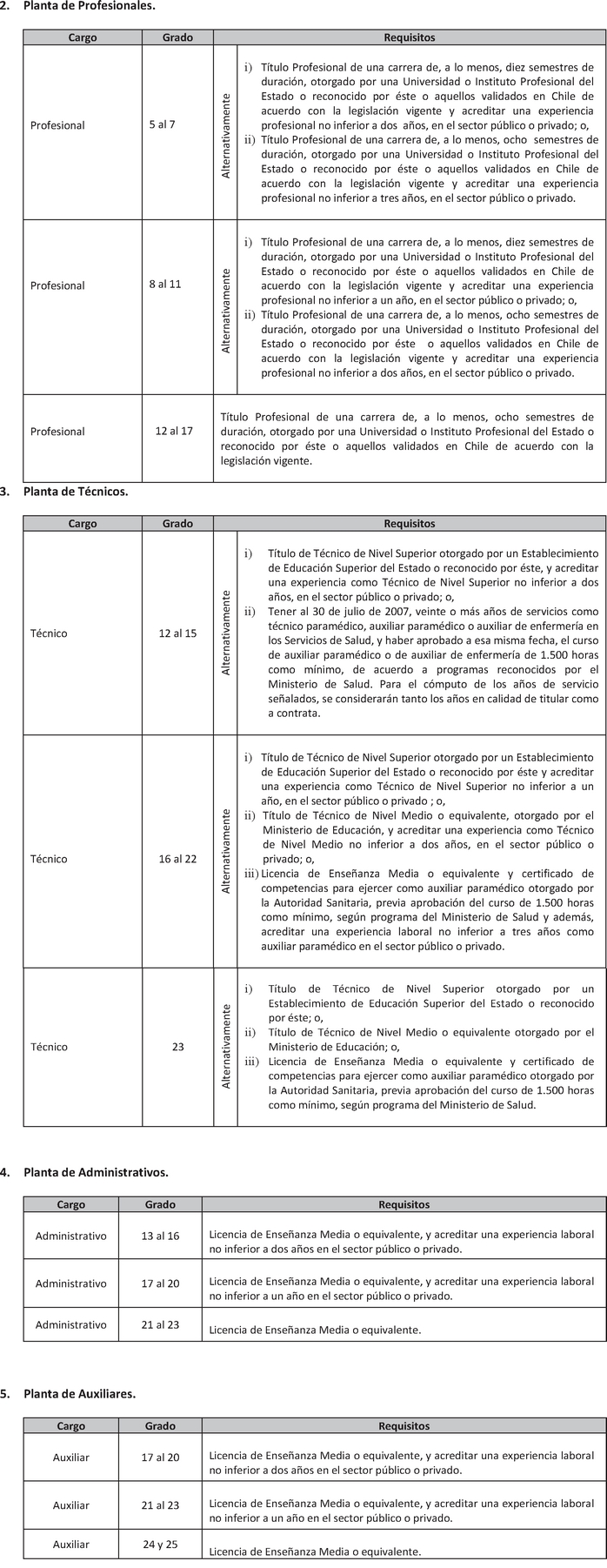 Artículo 2º. Establécense los siguientes requisitos para el ingreso y promoción en las plantas y cargos que se indican a continuación: