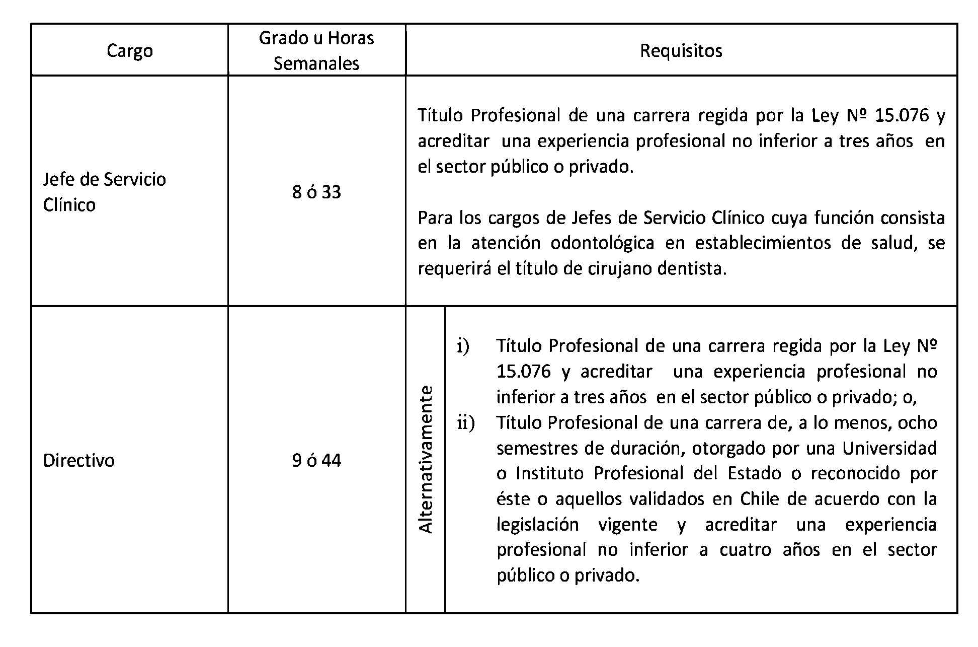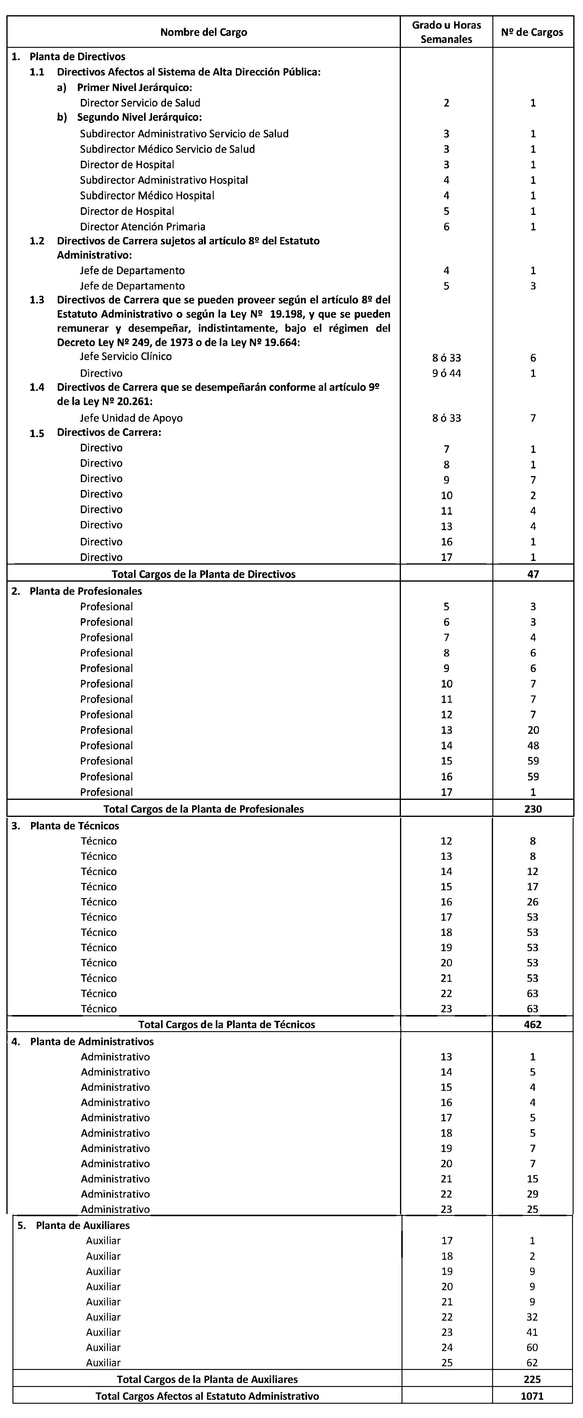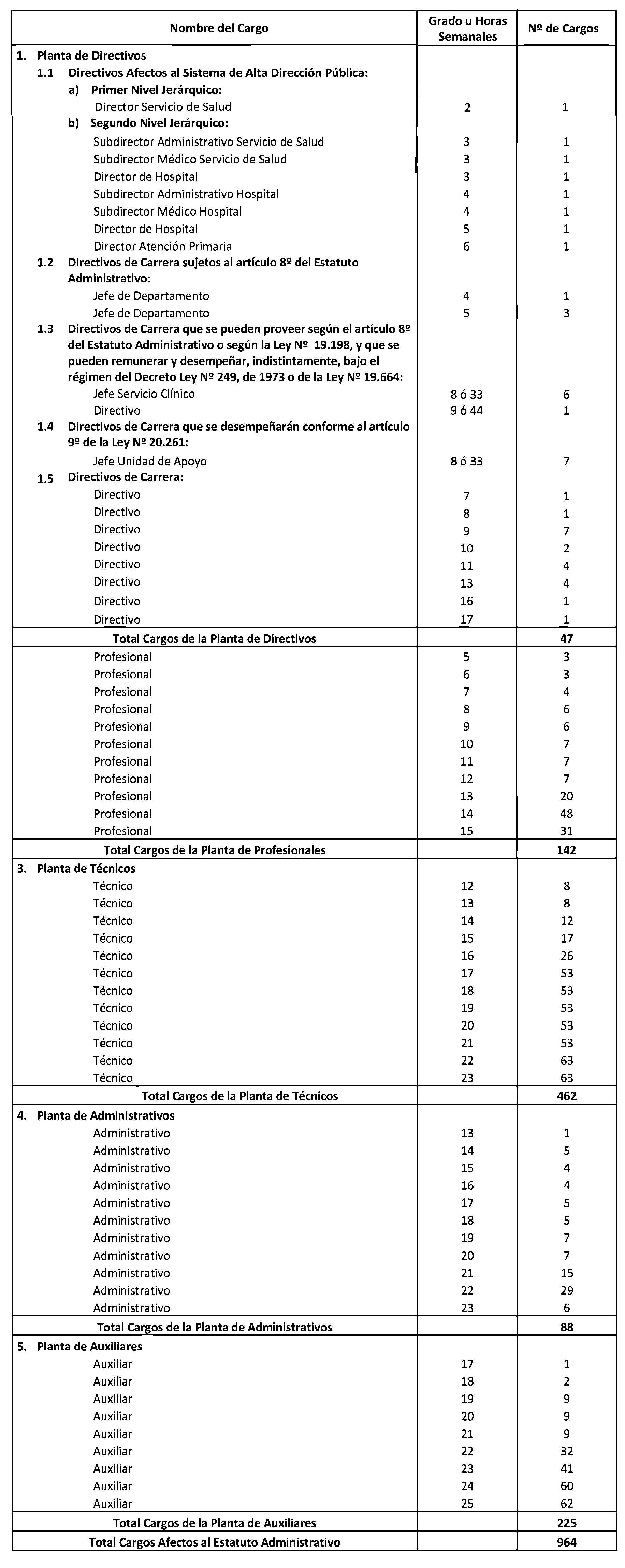 El Art. 1° del Decreto con fuerza de Ley 24, Salud, publicado el 17.01.2015, modifica los puntos 1.3 y 1.4. de la Planta de Personal establecida en el presente artículo en el sentido de suprimir, en la Planta de Directivos de Carrera, los cargos de "Directivo" y "Jefe Unidad de Apoyo" que la citada norma indica. Por su parte, su Art. 2° crea 297 horas en la Planta Profesional de Horas, que representan los cargos suprimidos en virtud del Art. 1°.