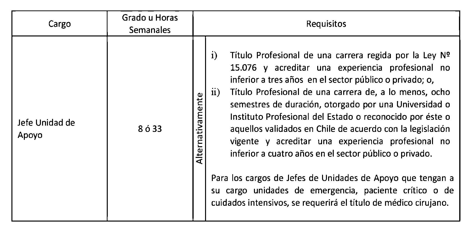 Los cargos de Jefes de Unidades de Apoyo señalados en el punto 1.4 de este artículo, corresponden a los cargos de Jefes de Unidades de Apoyo Diagnóstico y de Jefes de Unidades de Apoyo Clínico Terapéutico a que se refiere el artículo 9° de la Ley N° 20.261.