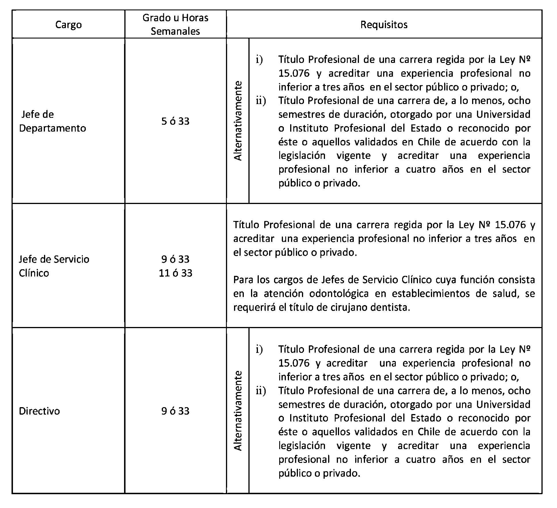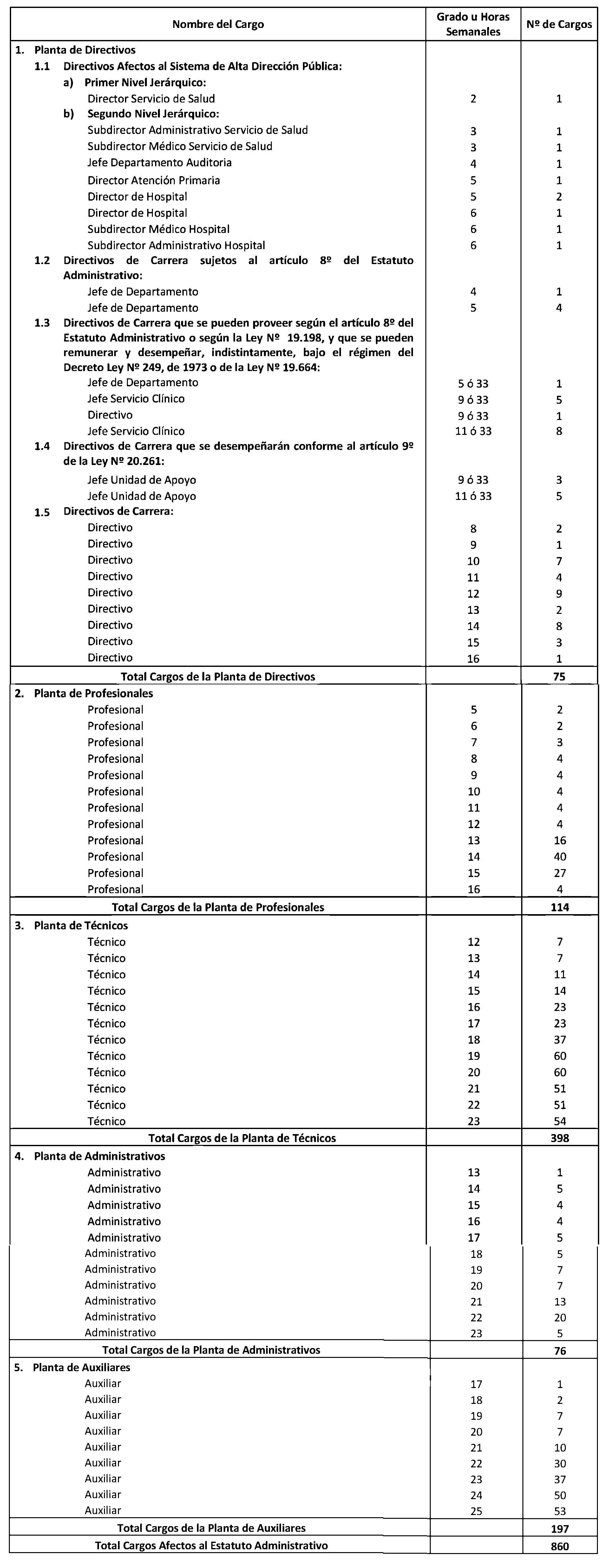 El Art. 1° del Decreto con fuerza de Ley 17, Salud, publicado el 17.01.2015, modifica los puntos 1.3 y 1.4. de la Planta de Personal establecida en el presente artículo en el sentido de suprimir, en la Planta de Directivos de Carrera, los cargos de "Jefe Servicio Clínico" y "Jefe Unidad de Apoyo" que la citada norma indica. Por su parte, su Art. 2° crea 198 horas en la Planta Profesional de Horas, que representan los cargos suprimidos en virtud del Art. 1°.
