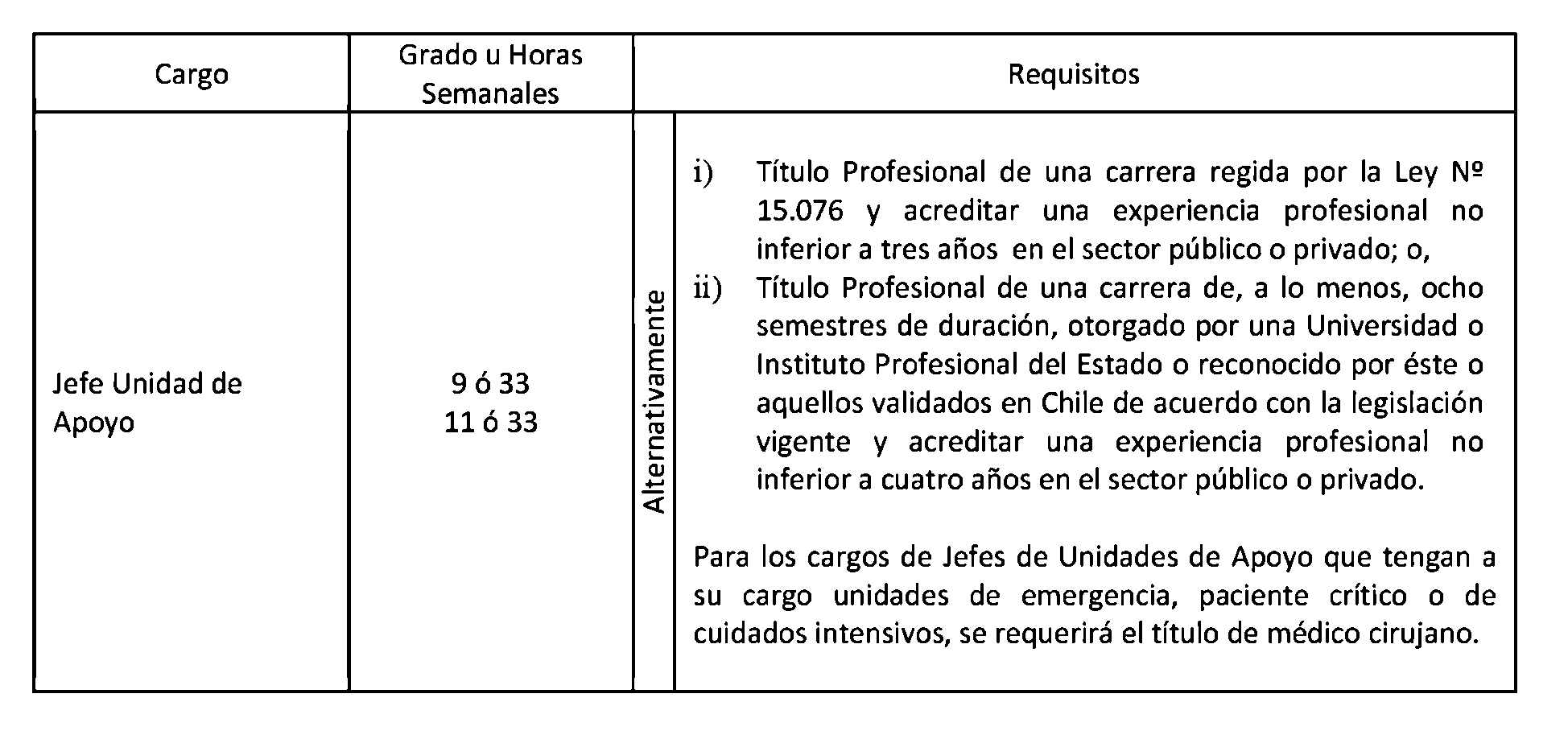 Los cargos de Jefes de Unidades de Apoyo señalados en el punto 1.4 de este artículo, corresponden a los cargos de Jefes de Unidades de Apoyo Diagnóstico y de Jefes de Unidades de Apoyo Clínico Terapéutico a que se refiere el artículo 9° de la Ley N° 20.261.