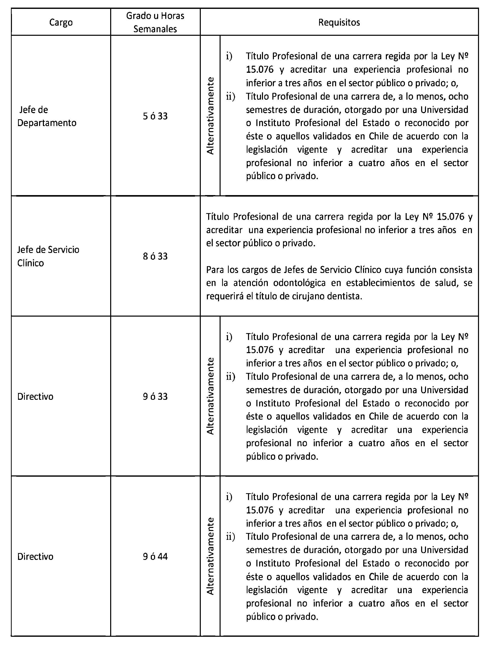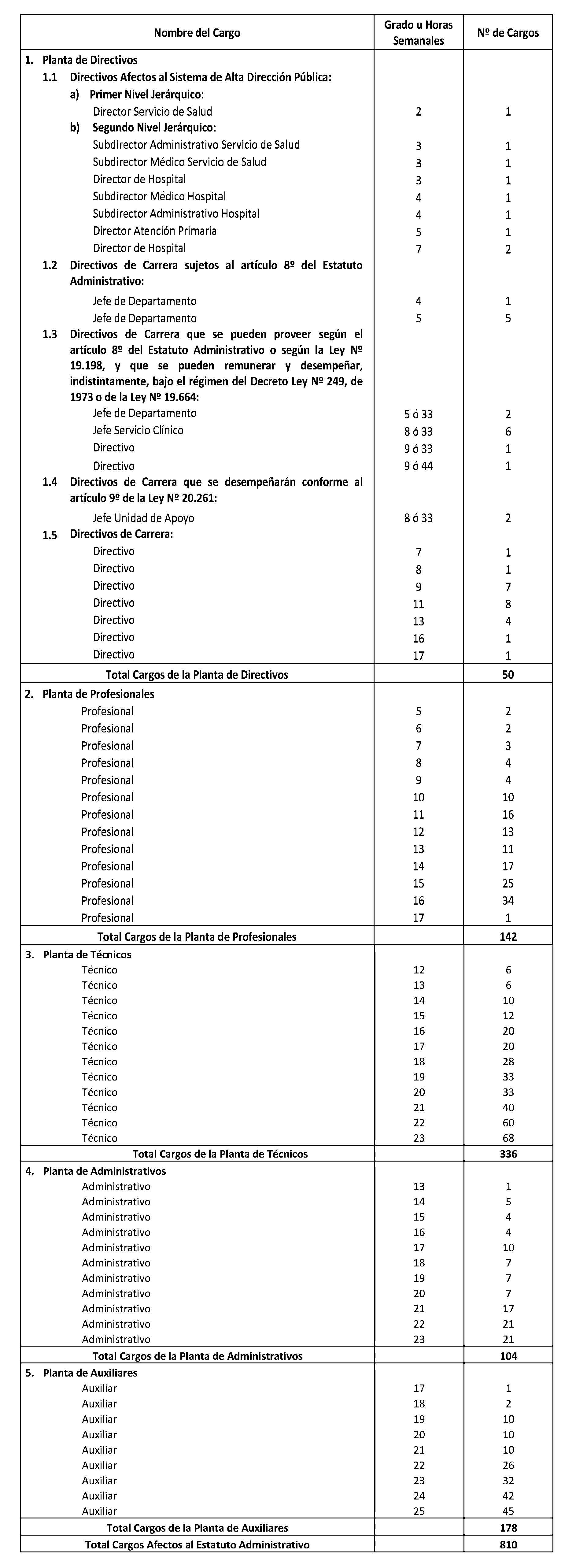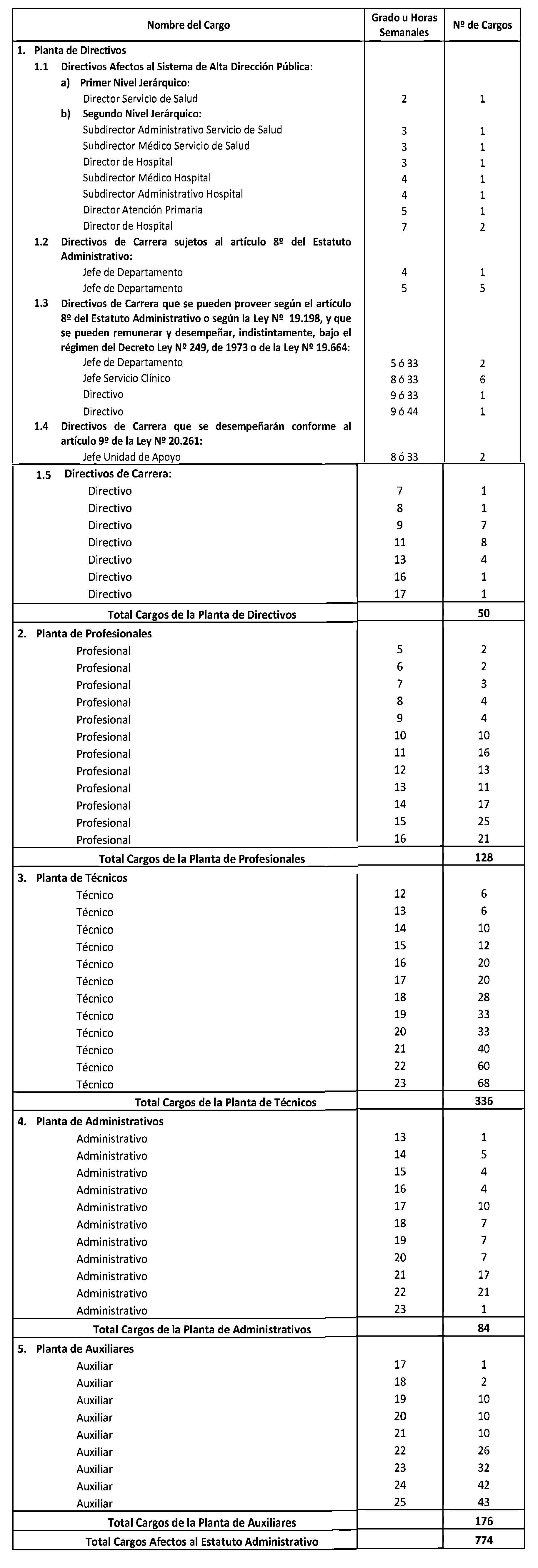 El Art. 1° del Decreto con fuerza de Ley 15, Salud, publicado el 17.01.2015, modifica los puntos 1.3 y 1.4. de la Planta de Personal establecida en el presente artículo en el sentido de suprimir, en la Planta de Directivos de Carrera, los cargos de "Directivo", "Jefe Servicio Clínico" y "Jefe Unidad de Apoyo" que la citada norma indica. Por su parte, su Art. 2° crea 242 horas en la Planta Profesional de Horas, que representan los cargos suprimidos en virtud del Art. 1°.