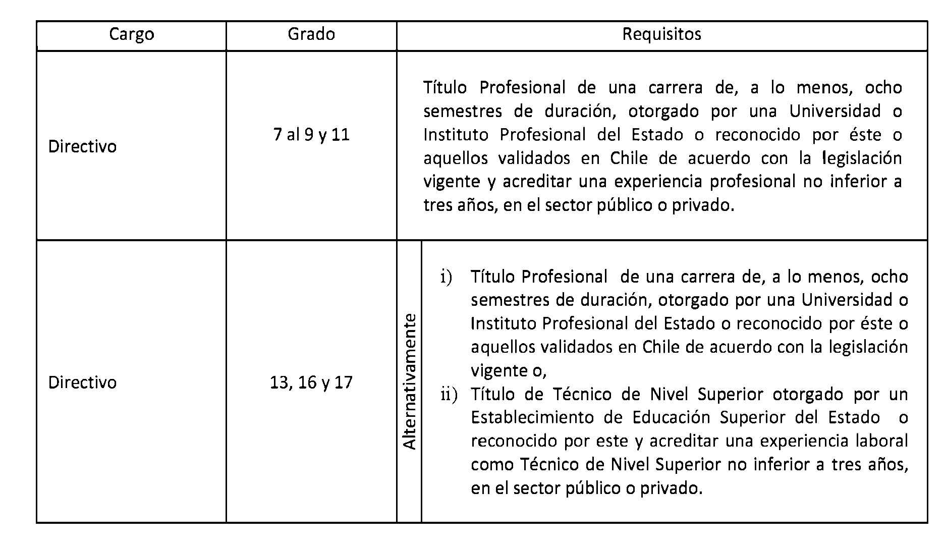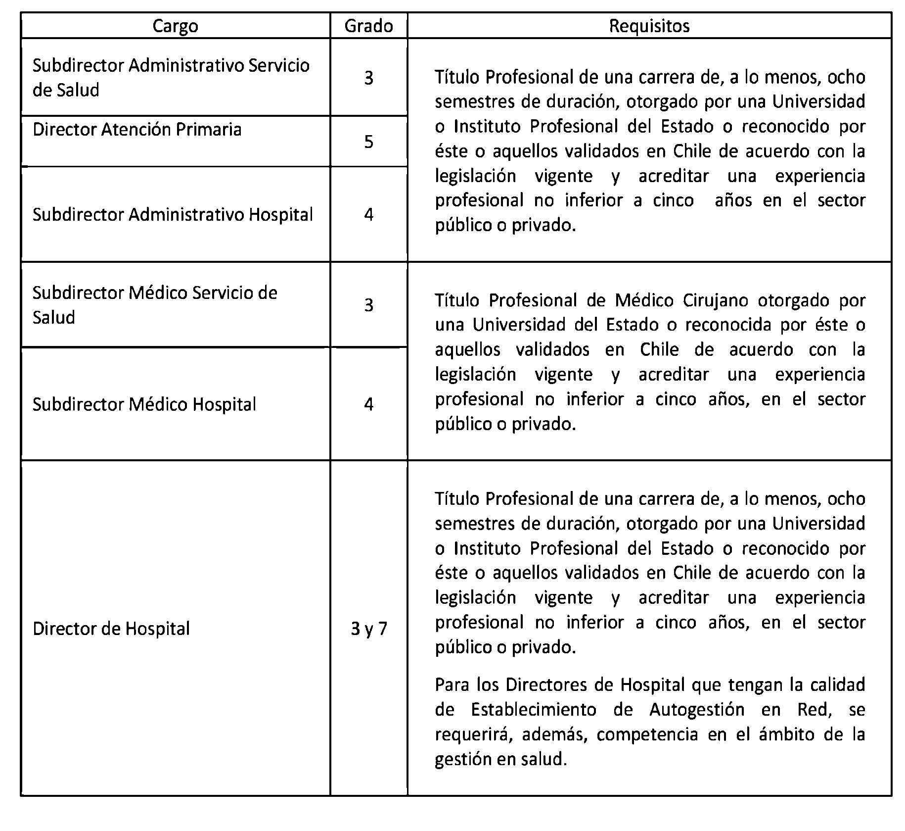 Enseguida, es necesario consignar que en los decretos con fuerza de ley Nºs. 9; 23; 24 y 29, relativos a los Servicios de Salud Arica, Arauco, Araucanía Norte y Chiloé, respectivamente, no se considera en sus estamentos directivos el grado 17. Sobre el particular, cabe manifestar que si bien de acuerdo con lo dispuesto en el artículo segundo transitorio, inciso primero, de la ley Nº 20.209, se exige que los grados iniciales y superiores de la Planta de Directivos, sean 17 y 2, no se facultó, sin embargo, al Presidente de la República para crear cargos en dicho estamento, lo que impediría cumplir, en lo pertinente, con el referido mandato legal. Ello, atendido que actualmente los indicados Servicios no contemplan el grado 17 en sus estamentos directivos.