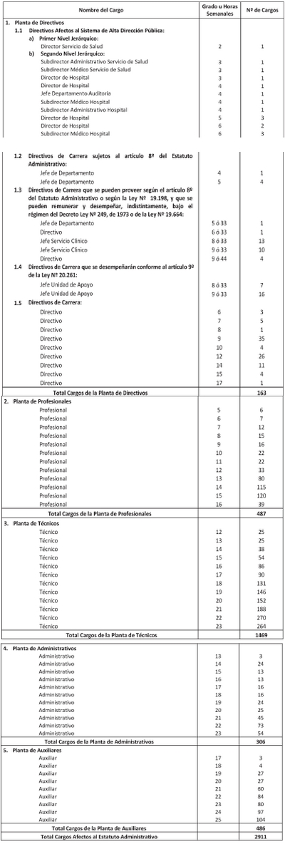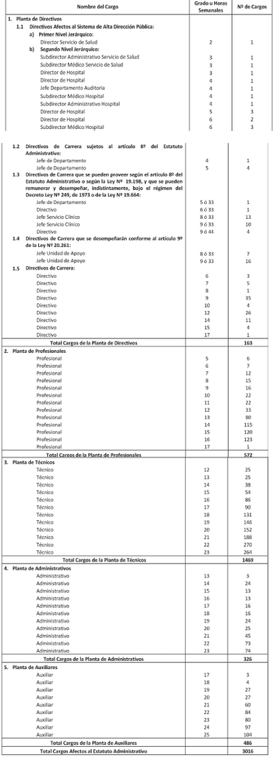 El Art. 1° del Decreto con fuerza de Ley 10, Salud, publicado el 17.01.2015, modifica los puntos 1.3 y 1.4. de la Planta de Personal establecida en el presente artículo en el sentido de suprimir, en la Planta de Directivos de Carrera, los cargos de "Directivo", "Jefe Servicio Clínico" y "Jefe Unidad de Apoyo" que la citada norma indica. Por su parte, su Art. 2° crea 1.529 horas en la Planta Profesional de Horas, que representan los cargos suprimidos en virtud del Art. 1°.