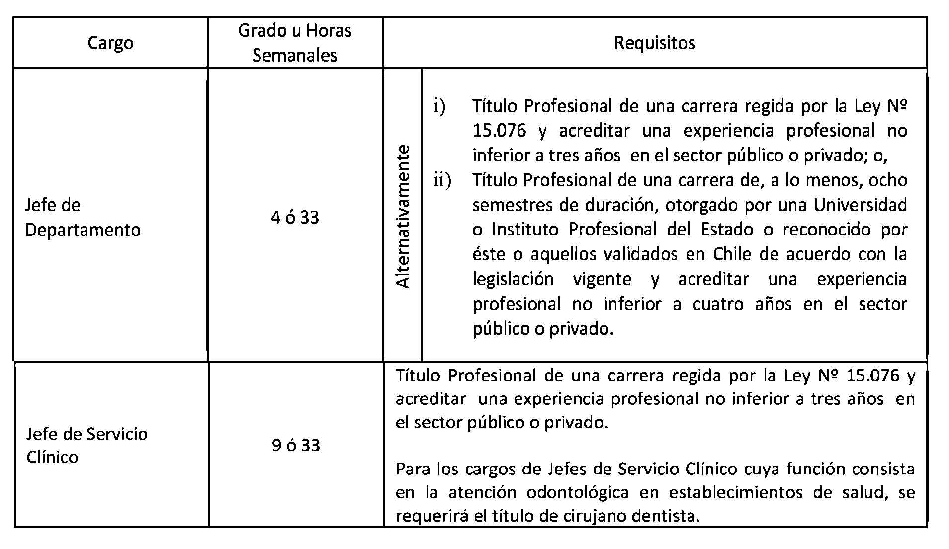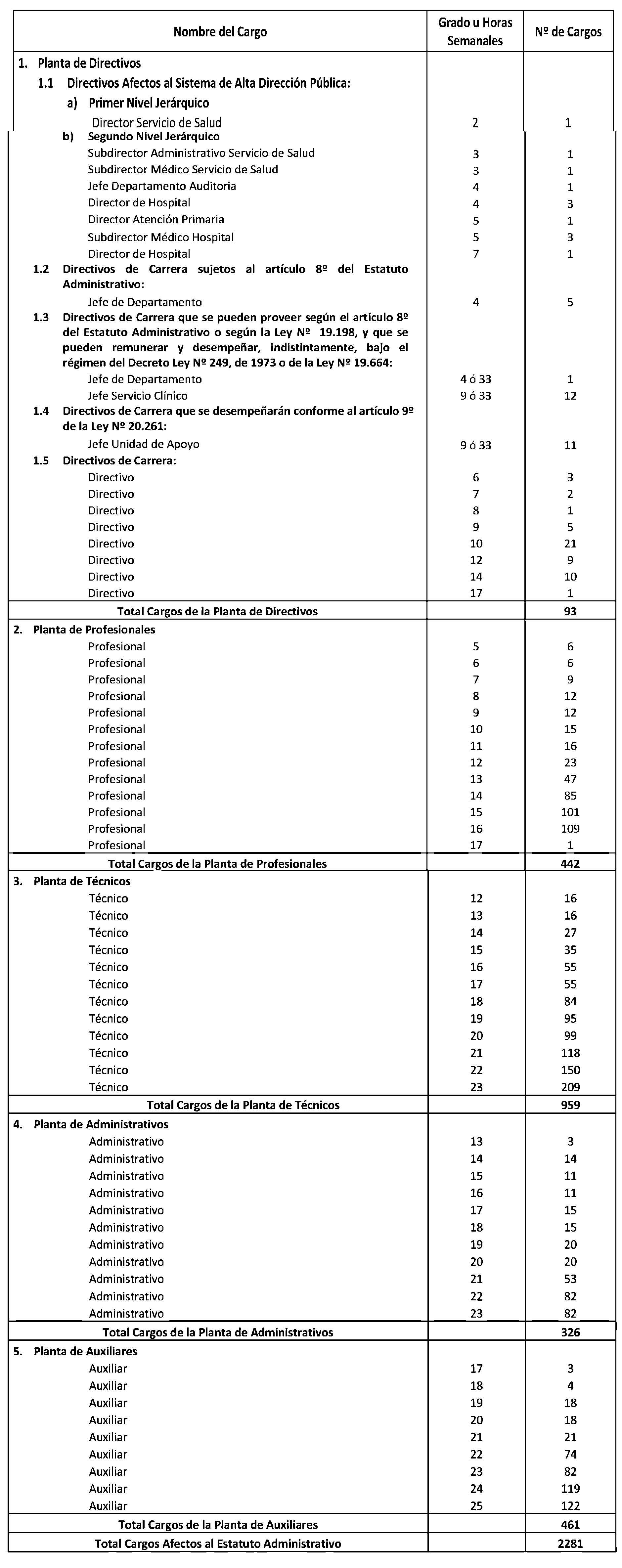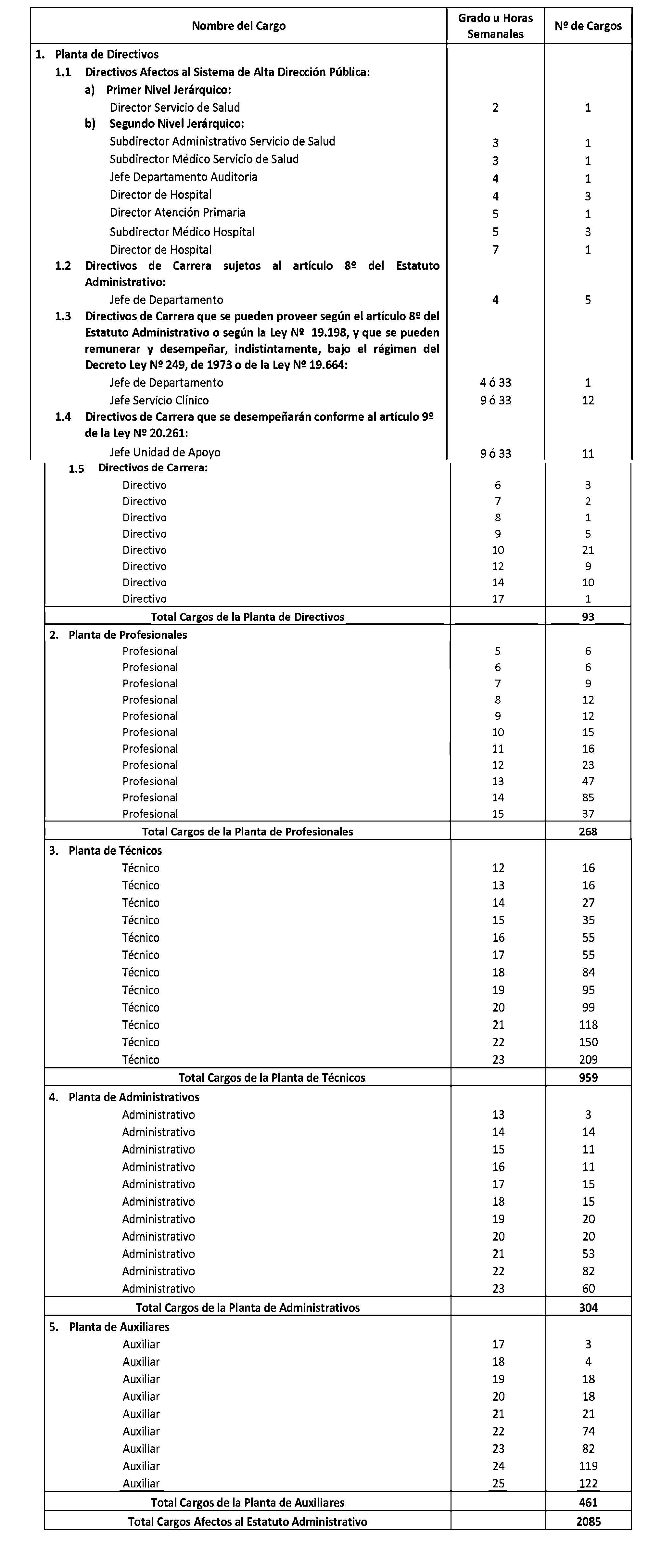 El Art. 1° del Decreto con fuerza de Ley 4, Salud, publicado el 17.01.2015, modifica los puntos 1.3 y 1.4. de la Planta de Personal establecida en el presente artículo en el sentido de suprimir, en la Planta de Directivos de Carrera, los cargos de "Jefe Servicio Clínico" y "Jefe Unidad de Apoyo" que la citada norma indica. Por su parte, su Art. 2° crea 495 horas en la Planta Profesional de Horas, que representan los cargos suprimidos en virtud del Art. 1°.