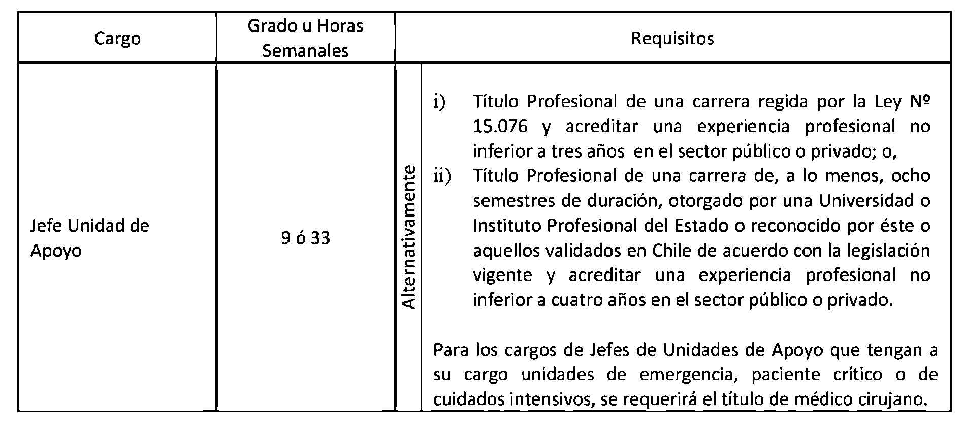Los cargos de Jefes de Unidades de Apoyo señalados en el punto 1.4 de este artículo, corresponden a los cargos de Jefes de Unidades de Apoyo Diagnóstico y de Jefes de Unidades de Apoyo Clínico Terapéutico a que se refiere el artículo 9° de la Ley N° 20.261.