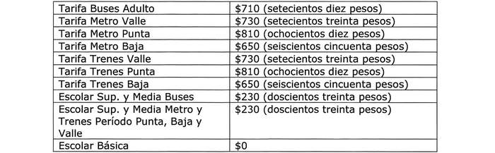 Los valores contenidos en la presente tabla serán los que sirvan de base para la aplicación del procedimiento de ajuste de tarifas, contenido en el Artículo 14 literal a) de la ley N° 20.378 y el decreto supremo N° 140, de 2009, del Ministerio de Transportes y Telecomunicaciones, y del procedimiento de determinación de nivel de tarifas establecido en el artículo 14 literal c) y artículo 15 de la ley N° 20.378.