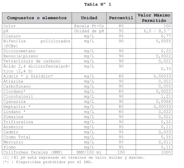 Artículo 3º.- Las normas primarias anuales de calidad ambiental para cada uno de los compuestos o elementos que se indican en la Tabla Nº 1 en las aguas continentales superficiales que se utilicen para actividades de recreación con contacto directo son los siguientes: