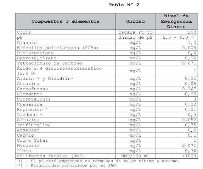 Artículo 4º.- Los niveles que determinan situaciones de emergencia ambiental diaria para actividades de recreación con contacto directo, son las que se indican en la Tabla Nº 2, teniendo en cuenta que cada uno de los compuestos o elementos que se indican, están referidos a concentraciones o unidades totales según corresponda.