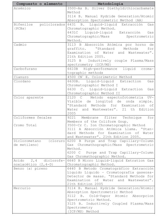 1. Metodologías descritas en: "Standard Methods for Examination of Water and Wastewater". 20th Edition 1998. Edited by Lenore S. Clesceri et al. APHA-AWWA-WPCF o ediciones posteriores.