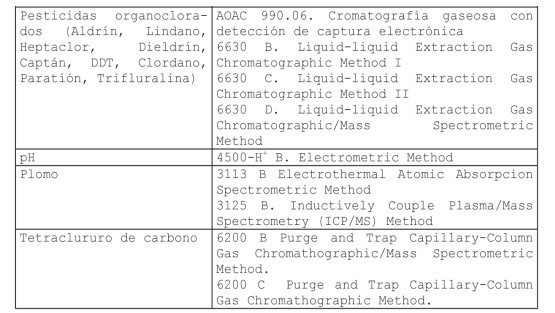 Artículo 14º.- El análisis de los compuestos o elementos incluidos en estas normas podrá efectuarse de acuerdo a los métodos analíticos que se indican a continuación, o sus versiones actualizadas, y los resultados deberán referirse a valores totales según corresponda.
