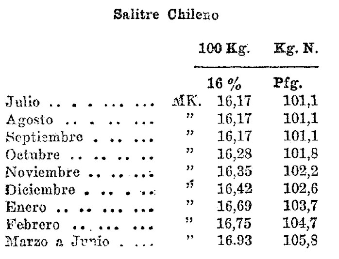 4°- El Gobierno alemán ha tomado conocimiento de que la Cosach se compromete a mantener para la venta de salitre chileno en Alemania los precios siguientes: