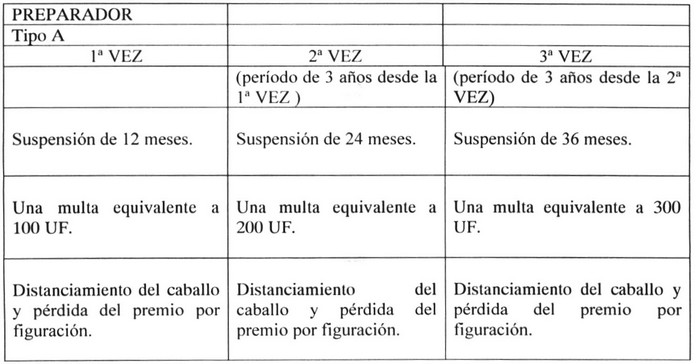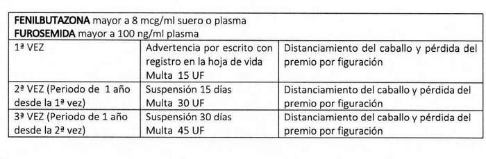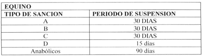 D.O. 06.06.2017referidas autoridades podrán aplicar las siguientes sanciones: amonestación, multa, defaulter, suspensión, distanciamiento, retiro de las patentes de profesionales hípicos, anulación de las inscripciones de productos y de propietarios en los registros respectivos e inscripciones en los Libros de Suspensiones y de Forfeits.