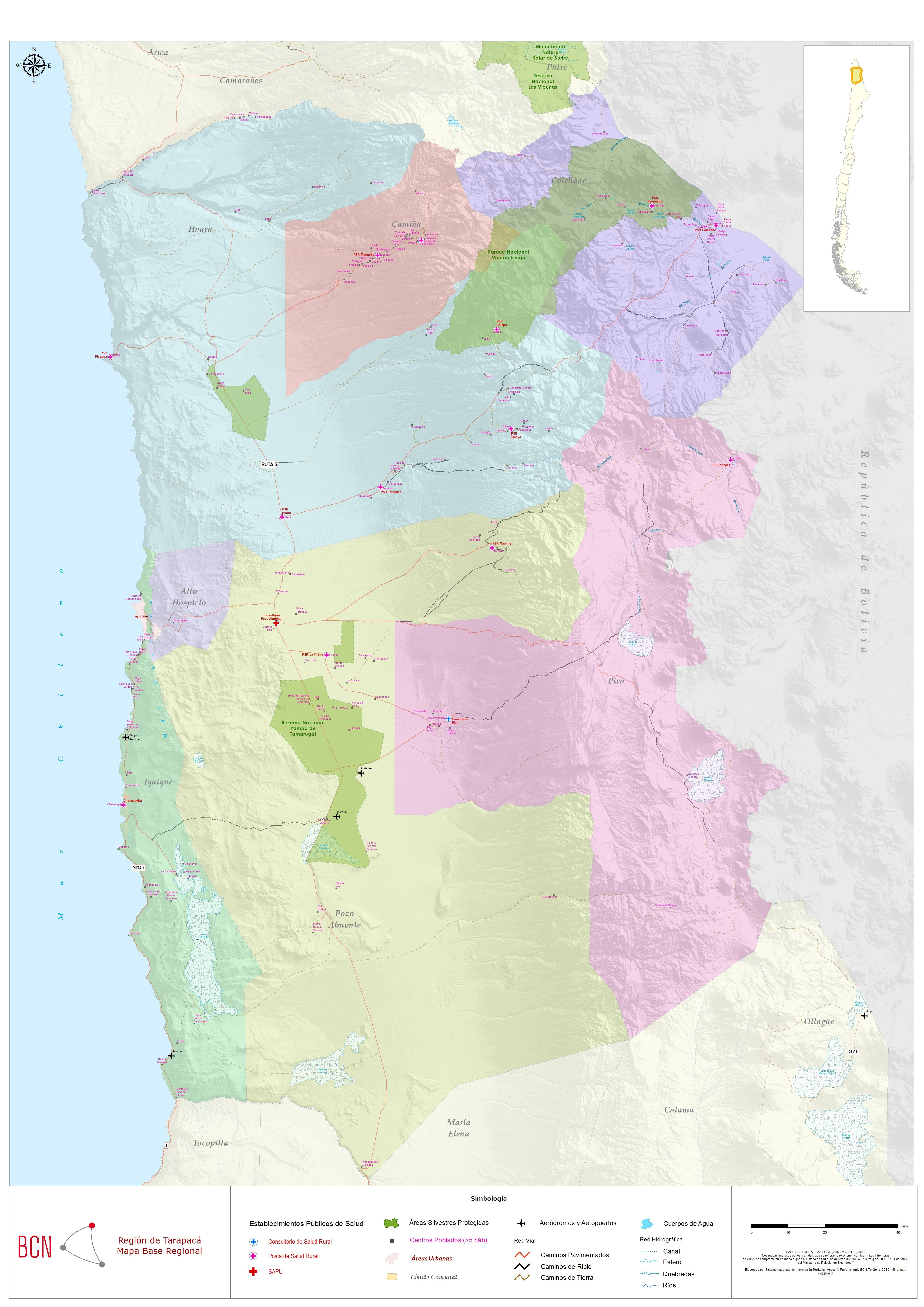 La Región de Tarapacá (I) se ubica en el norte del país, a una distancia superior a 1.800 kilómetros de la capital de Chile. El territorio regional se articula fundamentalmente a través de la ruta 5 Norte, principal eje vial de la región, aun cuando en la actualidad también ha adquirido importancia la ruta costera. Posee una superficie de 42.225,8 kilómetros cuadrados, equivalentes al 5,6% del territorio nacional. Según el Censo 2024 la población alcanza a 369.806 habitantes con una densidad de 8,76 habitantes por kilómetro cuadrado. Limita al norte con la Región de Arica-Parinacota, al este con la República de Bolivia y al oeste con el Océano Pacífico, abarcando desde los 19° 13' hasta los 21° 38' de latitud sur aproximadamente. Esta región se caracteriza por un clima donde predomina la ausencia absoluta de precipitaciones, convirtiéndose en un paisaje de extrema aridez y escasa vegetación, llegando a ser una de las regiones más secas del mundo. Su hidrografía presenta regímenes esporádicos dentro de un relieve irregular en comparación con las tres unidades tradicionales del país.